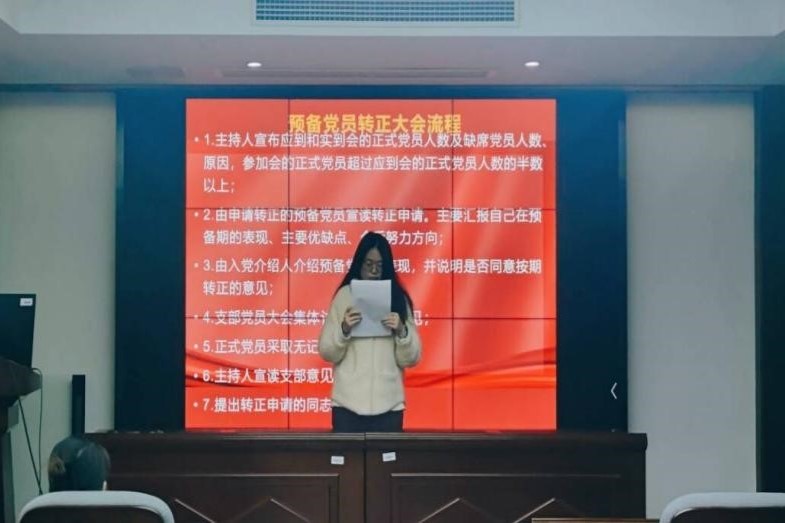 会议伊始, 郑繁简同志对会议流程进行了介绍。紧接着,赵祥康、路佳、彭程依次宣读《转正申请书》,对预备期一年内自己的理论学习、思想转变、学习生活、支部工作等方面进行汇报,并结合时事热点,阐述了自己在各个方面的优秀表现与不足之处,指出自身今后努力的方向,表明了正式加入党组织的坚定决心与态度。
