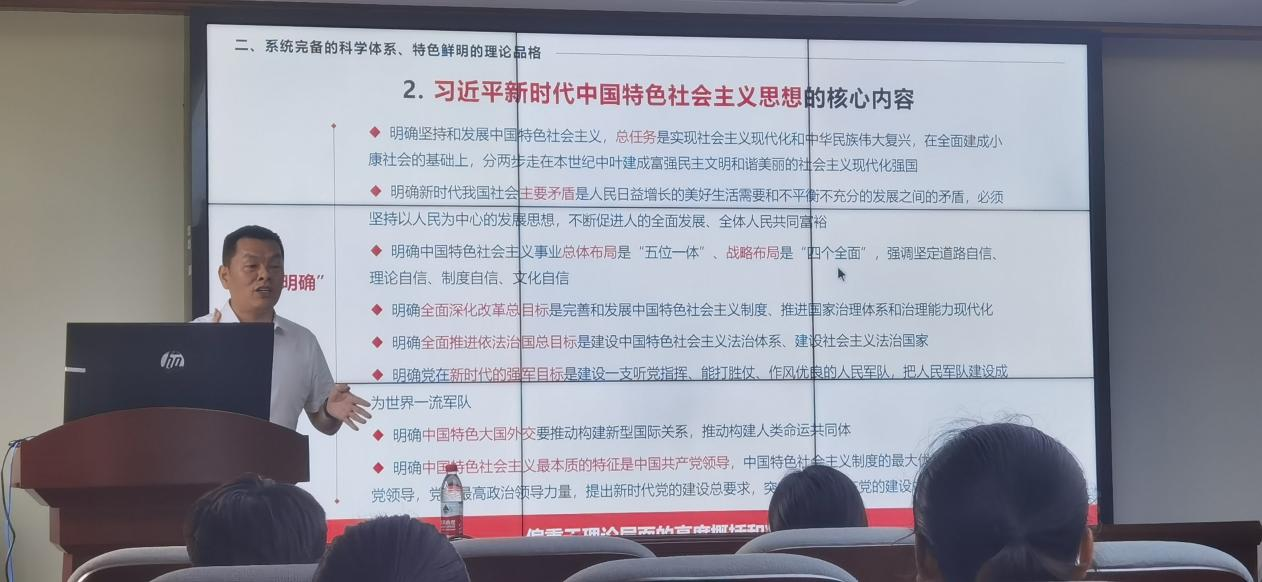 在讲授习近平新时代中国特色社会主义思想的核心内容时,陈院长引用大量习近平总书记的演讲原话与报告原文,对习近平新时代中国特色社会主义思想的核心内容进行深入浅出的阐述。陈院长带领同志们重温了习近平总书记在G20峰会、金砖国家领导人会晤、联合国大会上做的讲话,回顾了自党的十八大以来以习近平同志为核心的党中央领导开展的历史性变革和取得的历史性成就。