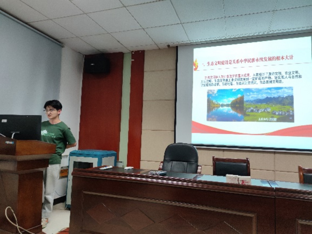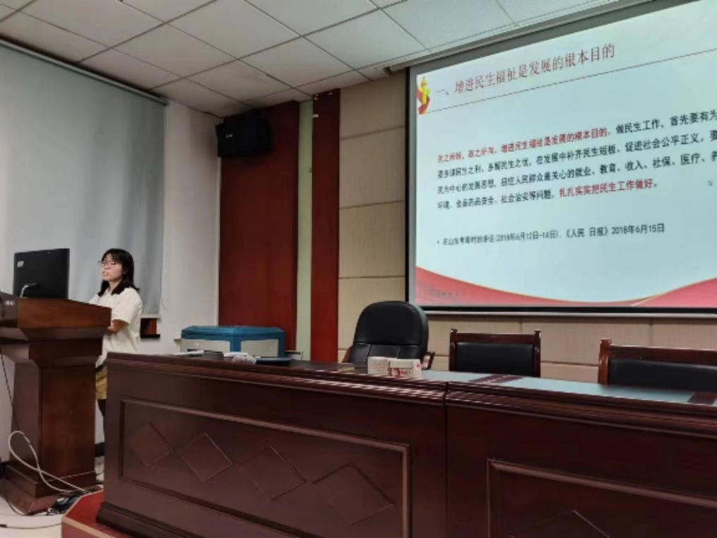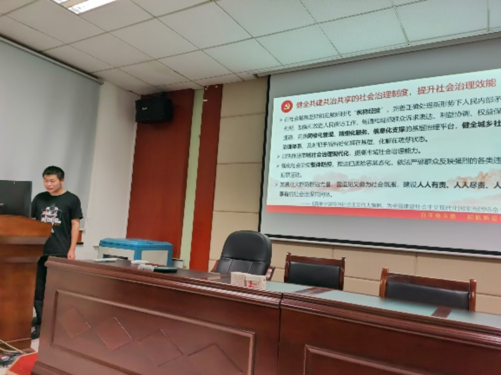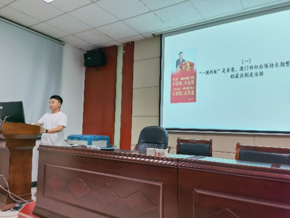 五位支委依次上台,向全体党员讲述主题党课。首先李茜同志以“坚持在发展中保障和改善民生”为主题分享道增进民生福祉是发展的根本目的,分配制度是促进共同富裕的基础性制度,就业是最基本的民生,社会保障体系是人民生活的安全网和社会运行的稳定器,人民健康是民族昌盛和国家强盛的重要标志。孙光宇同志围绕“坚持人与自然和谐共生”从生态文明建设的必要性、重要性与具体措施出发,循序渐进,逻辑严谨,图文并茂地讲述了生态文明建设的相关理论知识。随后,颜亚超同志进行了“坚决维护国家安全和社会稳定”的主题党课分享,他表示,统筹发展和安全是我们党治国理政的一个重大原则,我们要坚定不移贯彻总体国家安全观。余晨同志从听党指挥、能打胜仗、作风优良,党对人民军队的绝对领导,全面提高新时代备战打仗能力,全面推进国防和军队现代化,构建一体化的国家战略体系和能力五个方面,与大家分享了习近平新时代中国特色社会主义思想关于“把人民军队建设成为世界一流军队”的内容最后苌艳路同志以“坚持和完善‘一国两制’,推进祖国统一”为主题分享了“一国两制”是香港、澳门回归后保持长期繁荣稳定的最佳制度安排,坚持依法治港治澳,推动“一国两制”实践行稳致远和牢牢把握两岸关系主导权和主动权,坚定不移推进祖国统一大业三个方面的内容。