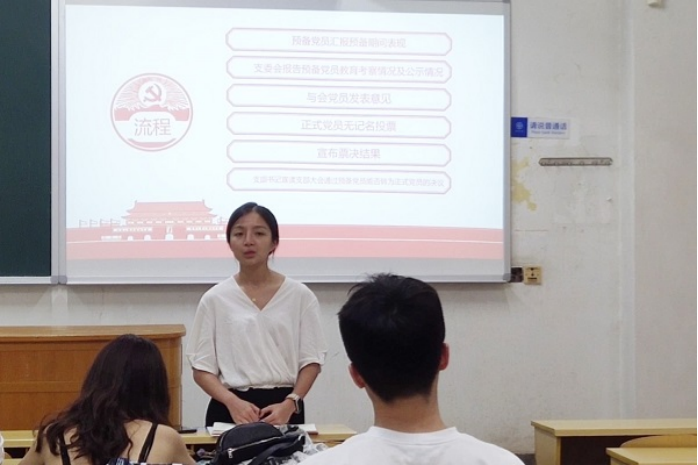 会议伊始,肖奕忆同志介绍了本次转正大会的具体流程并宣布会议正式开始。接着,肖奕忆、谢佳慧等九名预备党员同志依次上台汇报预备期的个人情况,总结了一年中在各个方面取得的进步与存在的不足,以及在预备期参与党组织生活的情况,并向党组织真诚提出转正申请。