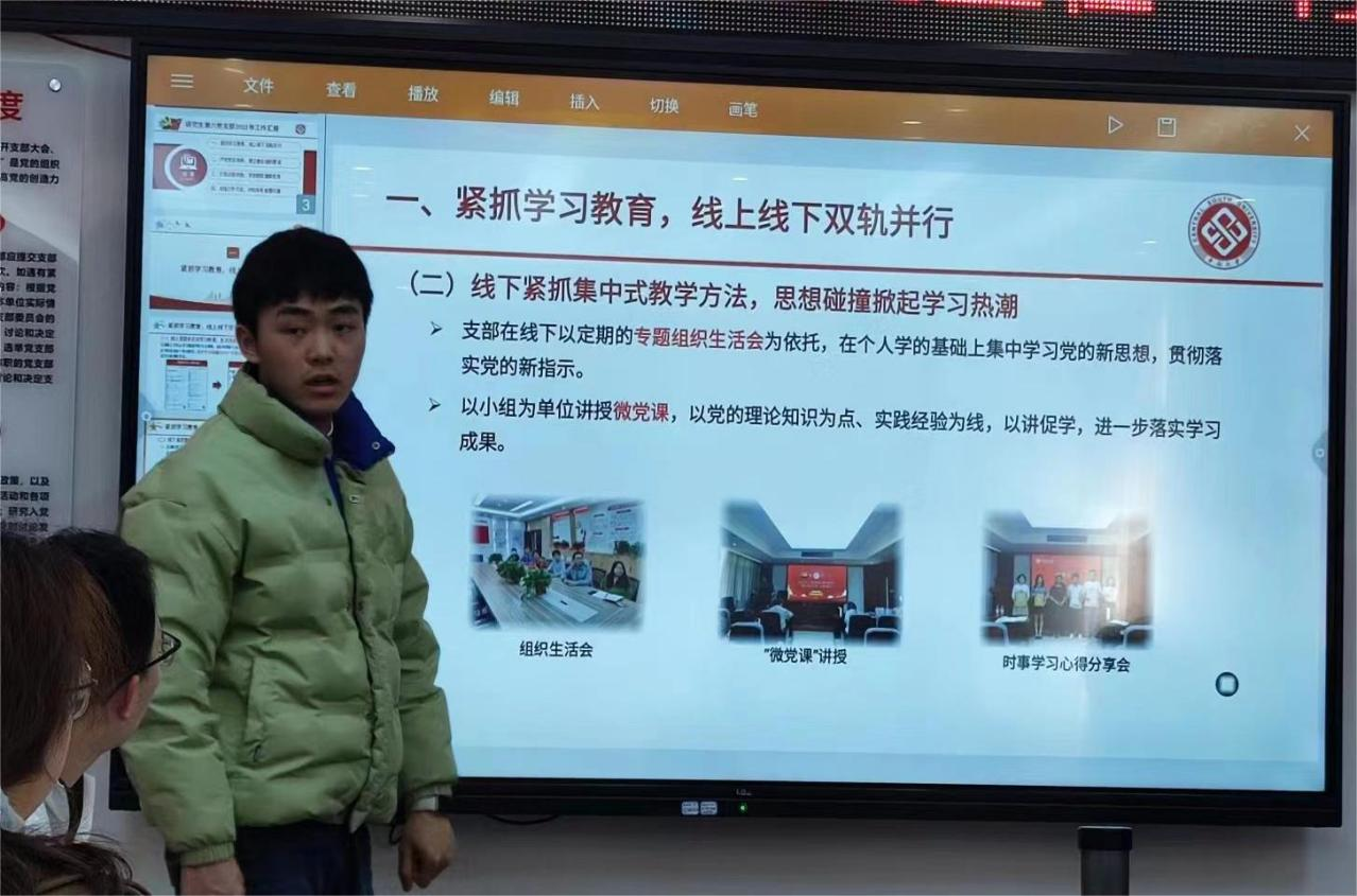 会议伊始,朱创宇同志从理论学习、党员培养、支部特色、未来发展四个方面进行汇报,梳理了党支部2022年度的发展情况。上一年度,支部通过严抓线下学习并积极拓宽学习渠道提高了支部党员的理论素养。同时支部注重多途径、多形式、全方位地健全组织建设,成功打造一系列支部特色品牌。
