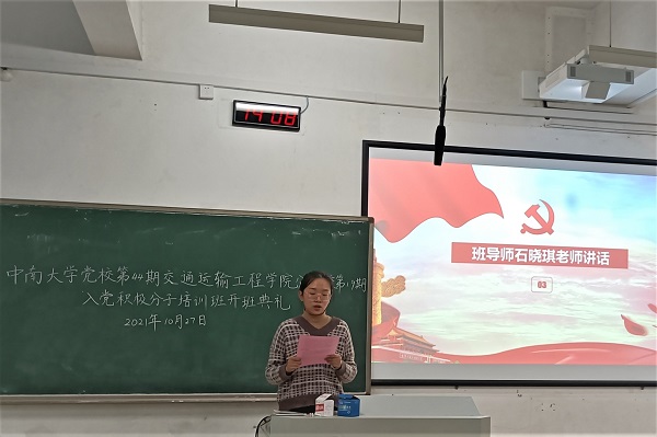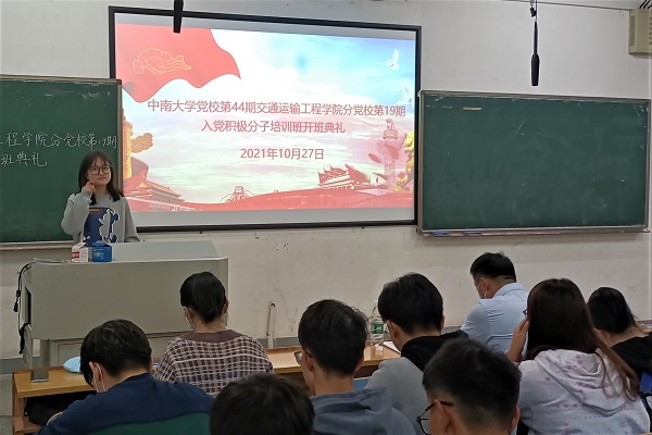 分党校第19期入党积极分子培训班在新校区B座118举行开班典礼。交通院党委副书记宋晓东老师,分党校班导师石晓琪老师,以及本期入党积极分子培训班全体学员参加此次开班典礼。典礼由王羽珊老师主持。