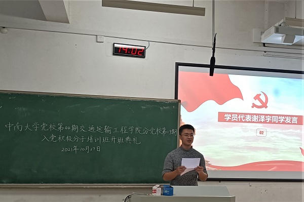 典礼伊始,全体同志起立奏唱国歌。随后,来自交通运输类2106班的学员代表谢泽宇同学发言。他首先代表全体培训班学员表达了对党组织的敬仰之情,之后代表全体入党培训班学员宣誓,在接下来的学习中将端正态度,严格遵守学校和培训班的学习纪律,圆满完成分党校的学业任务。最后,谢泽宇同学号召全体学员以此次培训为契机,努力在培训班中加强理论学习,进一步端正入党动机,不断提高党性修养。