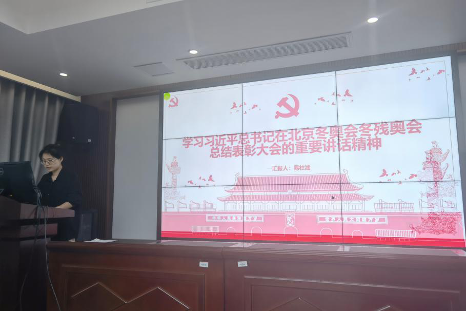会议伊始,易杜涵、陈艳琴同志讲授了习近平总书记在冬奥会和冬残奥会总结表彰大会上的重要讲话精神。首先,易杜涵同志就冬奥会的起源为各位同志进行了科普。接着,她结合冬奥会的格言以及本次2022年北京冬奥会“一起向未来”的口号、“绿色、共享、开放、廉洁”的理念等内容为同志们进行了系统性的介绍。她表示,北京冬奥会和冬残奥会是在我国全面建成小康社会、实现第一个百年奋斗目标、向第二个百年奋斗目标迈进的关键时期举办的重大标志性活动,具有里程碑意义。