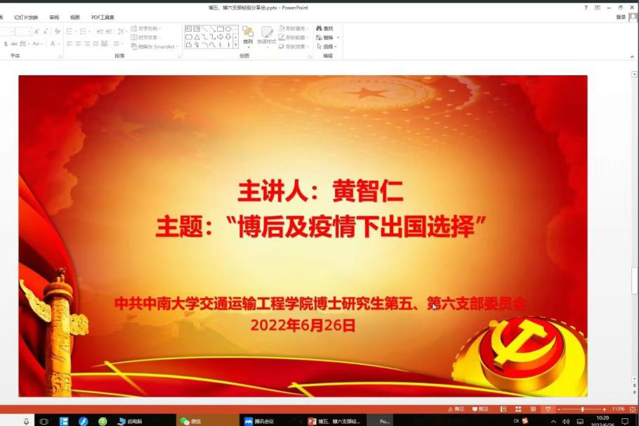 党课结束后,大会邀请了来自运输系的两位青年教师和两位博士代表进行了经验交流分享。17级博士黄智仁同志就“博后及疫情下的出国选择”介绍了博后的职位信息发布平台,并结合自己在芬兰的工作生活情况讲述生活的感悟,同时对疫情影响下的工作统计信息以及工业企业界的职位信息等内容进行分析。