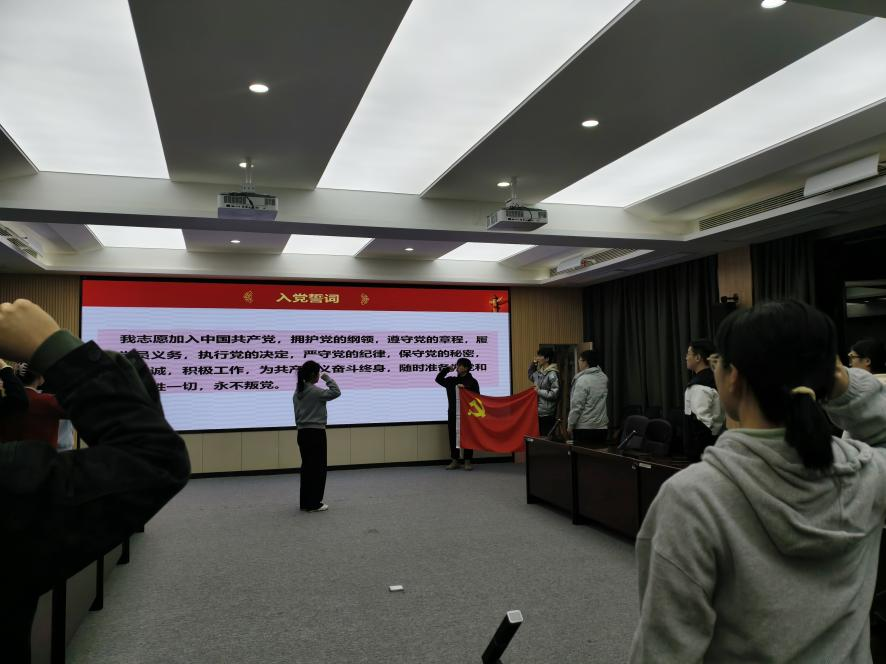 随后,在庄严的党旗见证下,刘亚璇同志举起右拳,庄严宣誓,铮铮誓言彰显了新党员对党忠诚的坚定信念。宣誓完毕后,全体参会人员奏唱《国际歌》,激昂的旋律凝聚起支部奋进力量。