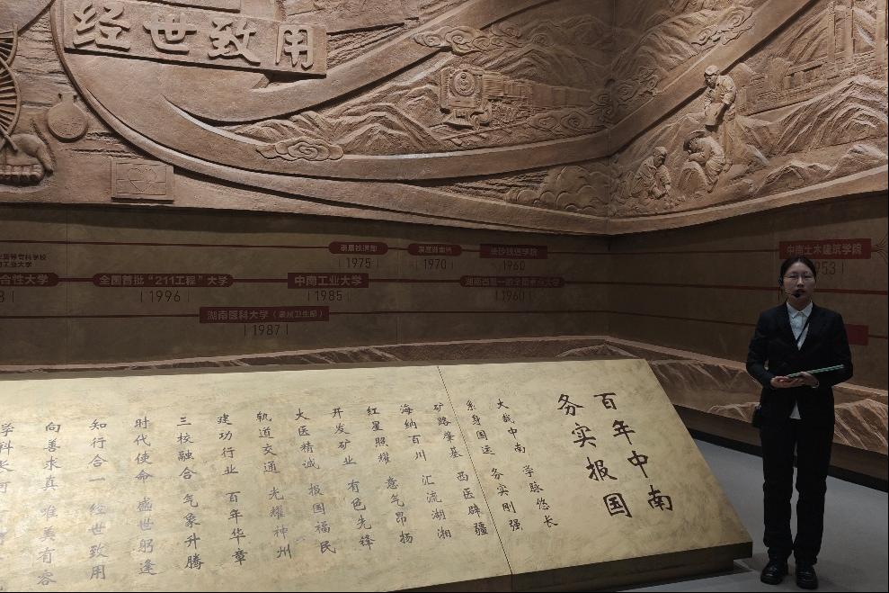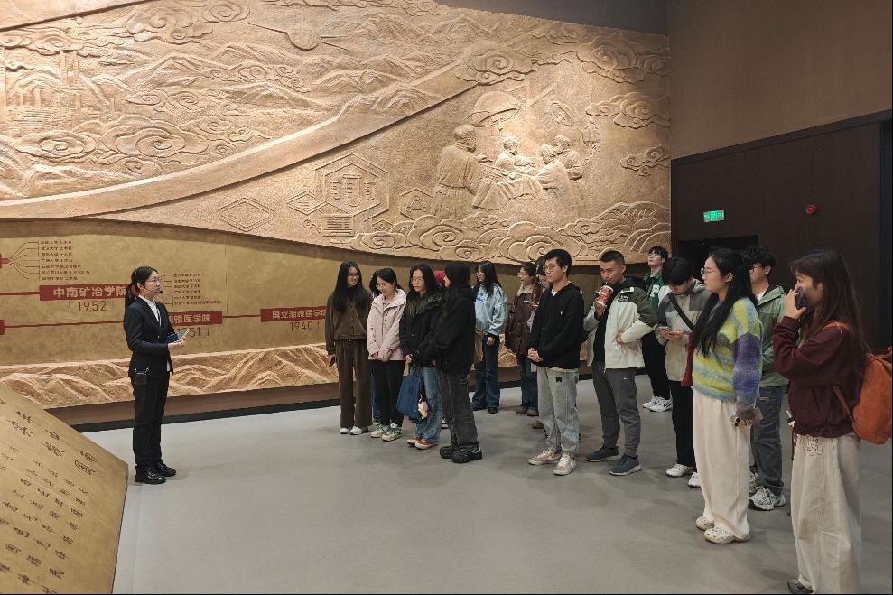 的学子,支部成员倍感亲切与自豪。讲解员详细介绍了长沙铁道学院师生参与勘测设计韶山铁路、参与建设成昆线一线天石拱桥的奋斗故事,那些凝结着师生智慧与汗水的工程奇迹,让大家深刻体会到先辈们的实干精神,更坚定了立足专业助力交通强国建设的信念。当看到1955年中南矿冶学院毕业生奔赴祖国各地前的珍贵合影时,姚若冰同志表示:“前辈们以青春赴使命的担当,正是‘务实报国’精神的生动诠释。作为新时代研究生党员,我们更要将个人理想融入国家发展,在轨道交通领域刻苦钻研,不负时代重托。”参观结束后,全体成员在序厅浮雕前合影留念,定格下这场意义深远的精神“寻根”之旅。