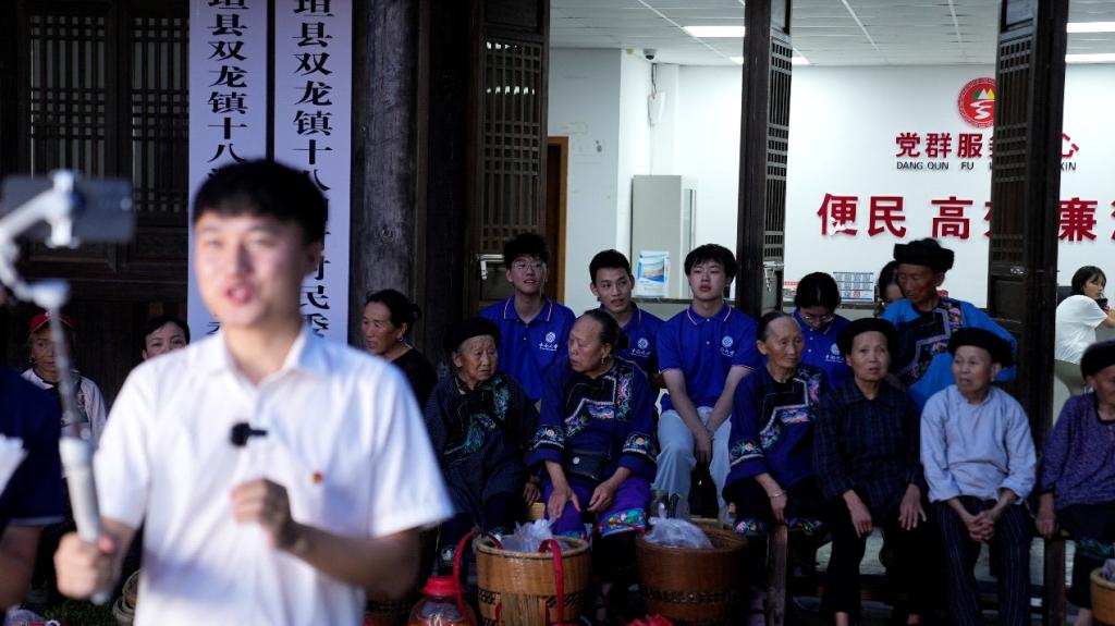 实践团成员直播前期与施康书记探讨分工,帮助苗族阿公阿婆整理、搬运带来的商品,帮忙布置直播间。