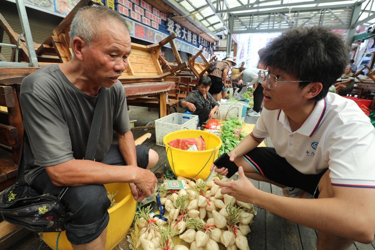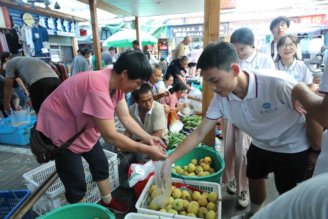 火车抵达铜仁后,农户们迈开步伐,即使他们肩负重担,也竞相奔向售货摊位。跟随农户的步伐,团队成员抵达了贸易市场,并对部分摊位进行观摩采访,农户们热情地推销自家的农产品,顾客们仔细挑选着心仪的果蔬。团队成员穿梭于人潮之中,深刻了解到慢火车对农户销售农产品的极大帮助。怀化与铜仁,两座相距140公里的城市,在一列慢火车的连接下亦无地域之分。
