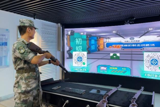 的国防成就”后,支部同学们深切感受到学校和祖国发展同频共振,自豪感油然而生。讲解完毕,同学们自由参观了拓展学习区。栩栩如生的武器模型和相关的电子资料介绍让同学们对国防科技有了更进一步的了解。最后一个环节是射击体验,同学们通过现代化科技,身临其境地感受到军人们在战场上面对的险象环生的境况和激情勇猛的身姿。
