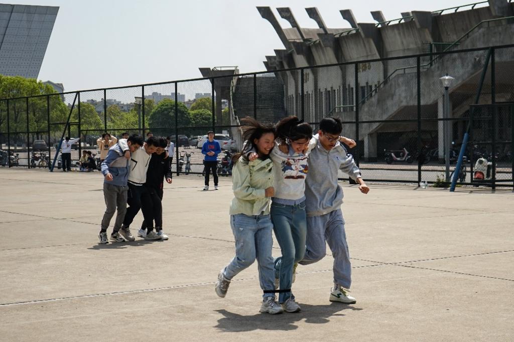 经过一中午的休整,下午14:20的下午场比赛紧张有序地开展起来。首先进行的是互助运送项目,每组两人,一人负责吹气球,气球扎好后,另一人迅速背负该同学前往终点,用时短者获胜。紧接着,加强版绑足同行项目——五人六足也开始进行,各支参赛队伍大跨步向终点迈进,行进默契而平稳有序。