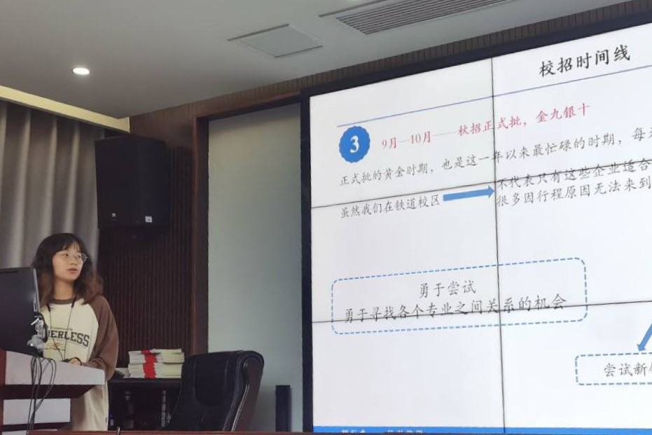 崔云平同学分享结束后,赵惠娴同学围绕“就业前期准备——信息收集”展示了校招时间线:5月至6月底各大企业会发布实习信息;7月至8月底企业提前批岗位集中发布,这是同学们第一次接触企业、了解岗位的机会,同学们可以借此锻炼胆量和语言能力并积累面试经验;9月至10月是秋招正式批的黄金时期。赵惠娴同学鼓励同学们积极寻找专业和不同岗位的关联点,大胆尝试,抓住机会,并以自身专业为例指出了轨道交通信号与控制专业的各种去向。然后,赵惠娴同学分享了多种就业信息收集方式和渠道,如av直播