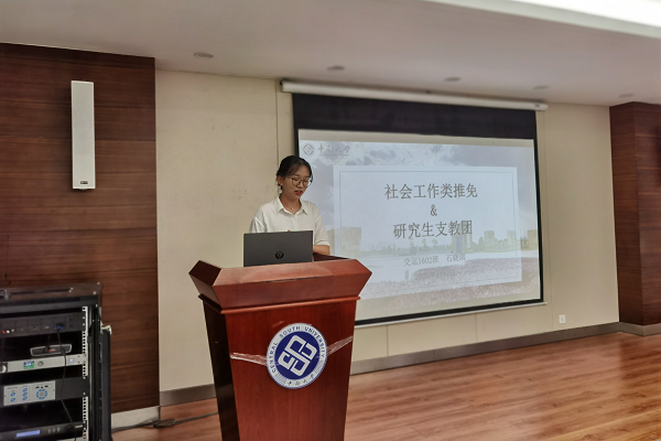 结束观看视频后,经验交流环节正式开始。首先由伍妍妮同学分享了考研的相关经验,从考研准备时间、考研内容以及相关注意事项等方面做了详细介绍,解答了同学们的不少疑惑。紧接着,陈伊琪与李韬同学就保研分享了她们的经验。陈伊琪同学着重从保研要求、院校的选择以及保研时间线进行介绍,她的介绍大大减少了同学们对保研的陌生感。而李韬同学则侧重保研的选择方向,向同学们讲解了学硕与专硕的具体内容,解释了硕博连读与直博的区别,让同学们在未来的选择上更有信心与经验。其后,石晓琪老师结合自身的经验,与同学们分享了行政保研与支教保研的内容。石老师有趣的经历,生动的讲述调动了现场的气氛,引起现场掌声阵阵。最后由慕希雅同学关于就业与工作方面的相关信息进行了分享。他结合自身初入职场的心得,给予同学们诸多忠告与提示,也让同学们在毕业后能有更多选择。