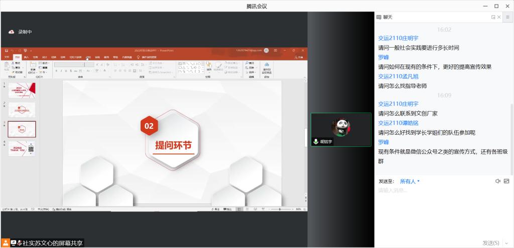 提问环节结束后,本次分享会顺利结束。此次会议,不仅让同学们进一步了解了暑期社会实践,同时也让同学们认识到了社会实践的重要意义。相信在本次分享会后,会有更多交院学子积极参与暑期社会实践,融入社会、感受社会,为广大的群众贡献自己的青春力量。