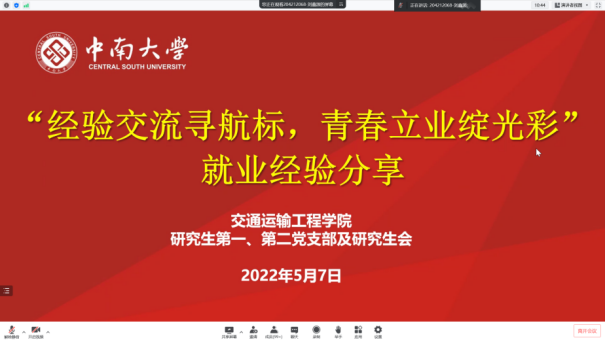 为了更好地发挥党员同志的“传帮带”作用及基层党支部的战斗堡垒作用,帮助同学们解决就业疑惑,做好职业规划,5月7日晚19点,交通院研究生第一、第二党支部及学院研究生会以线上的形式联合举办了“经验交流寻航标,青春立业绽光彩”就业经验分享活动。本次活动邀请了四位优秀的毕业生党员高辉、杨友朋、徐韵茹、樊立峰同志分享各自的就业经验。全院170余名研究生参加了本次活动,活动由研究生第二党支部刘鑫源同志主持。