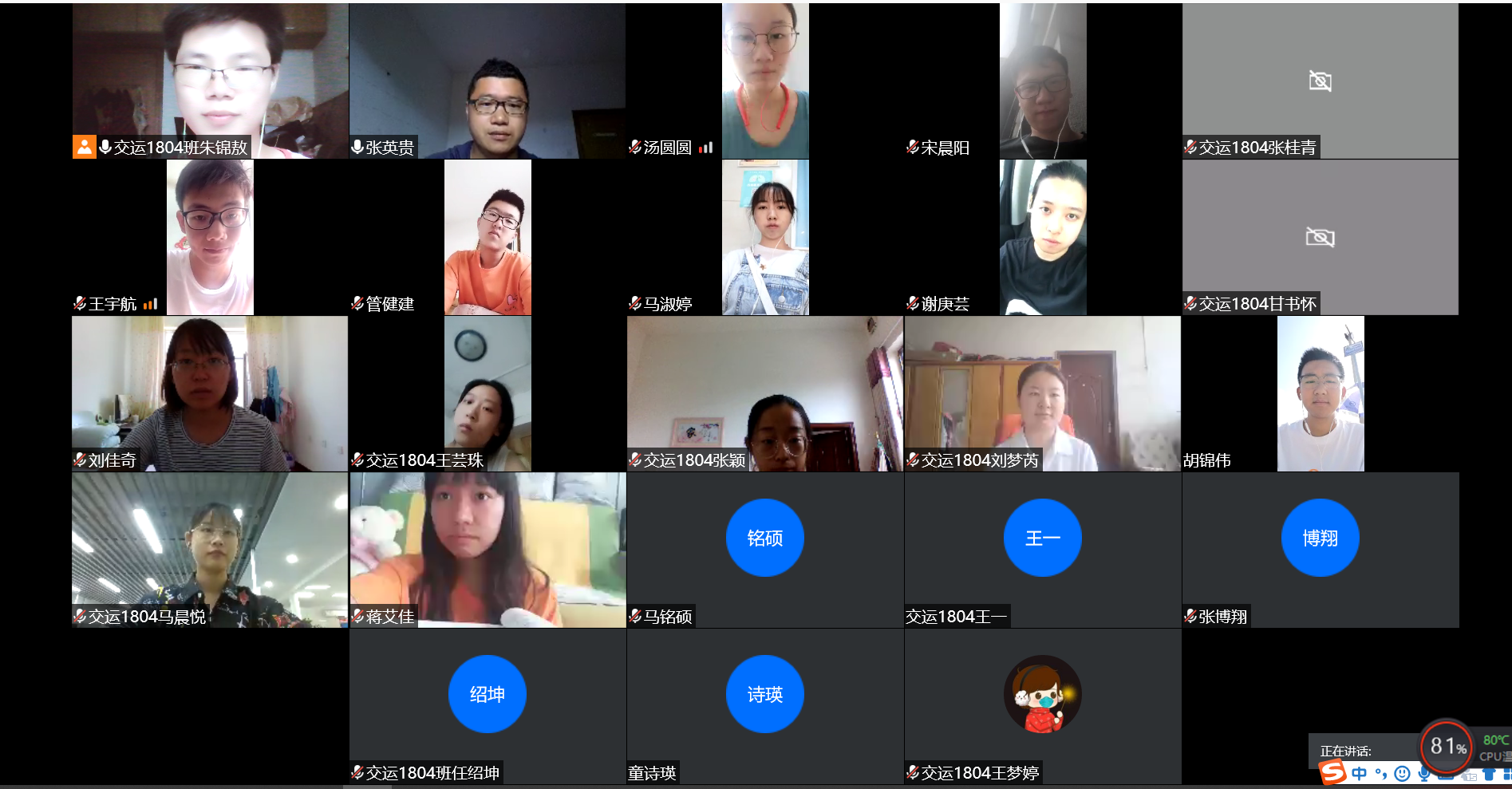 8月7日早上9点,交通运输1804班开展了一次线上班会暨期末复习动员会,本次班会旨在动员同学们为即将到来的期末考试做好复习计划,组织督促大家高效有计划地进行复习,并对相关班级工作进行部署。班导师张英贵老师受邀参加此次线上班会,班长朱锦敖同学为会议主讲人,班级同学实到22人,请假2人。