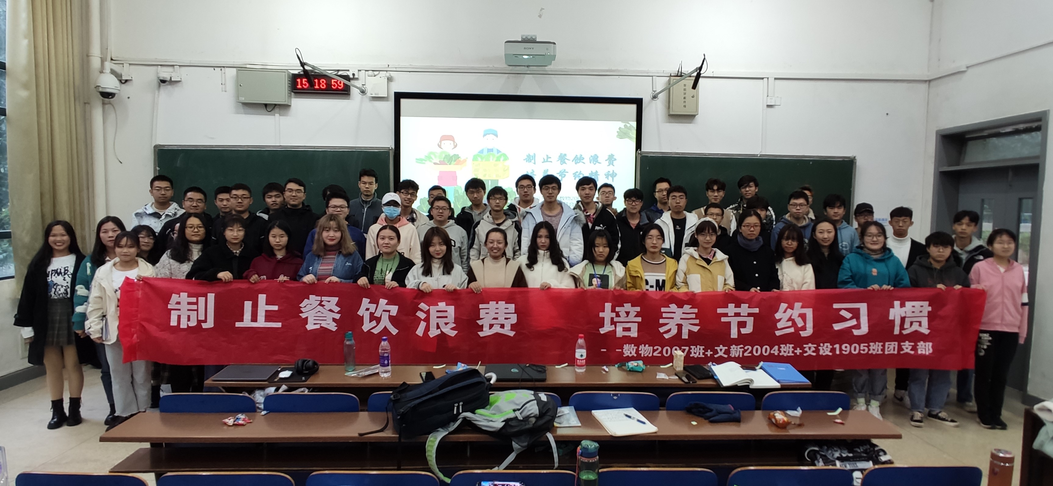 11月21日下午两点,交设1905班、文新2004班、数物2007班在D座128教室举行了以“制止餐饮浪费,培养节约习惯”为主题的联合团日活动。活动分为破冰环节、视频观看和活动总结三个主要部分,每个部分都有三个班的同学参加,由三个班的团支书共同主持。