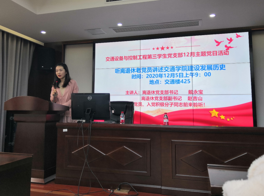 铁道学院和交通院建设发展历史,本次党日活动邀请到了离退休党支部书记戴永宝和离退休党支部副书记赵吉山,支部在校党员和入党积极分子,发展对象参加本次活动,报告会由支部预备党员郭秉筠同志主持。