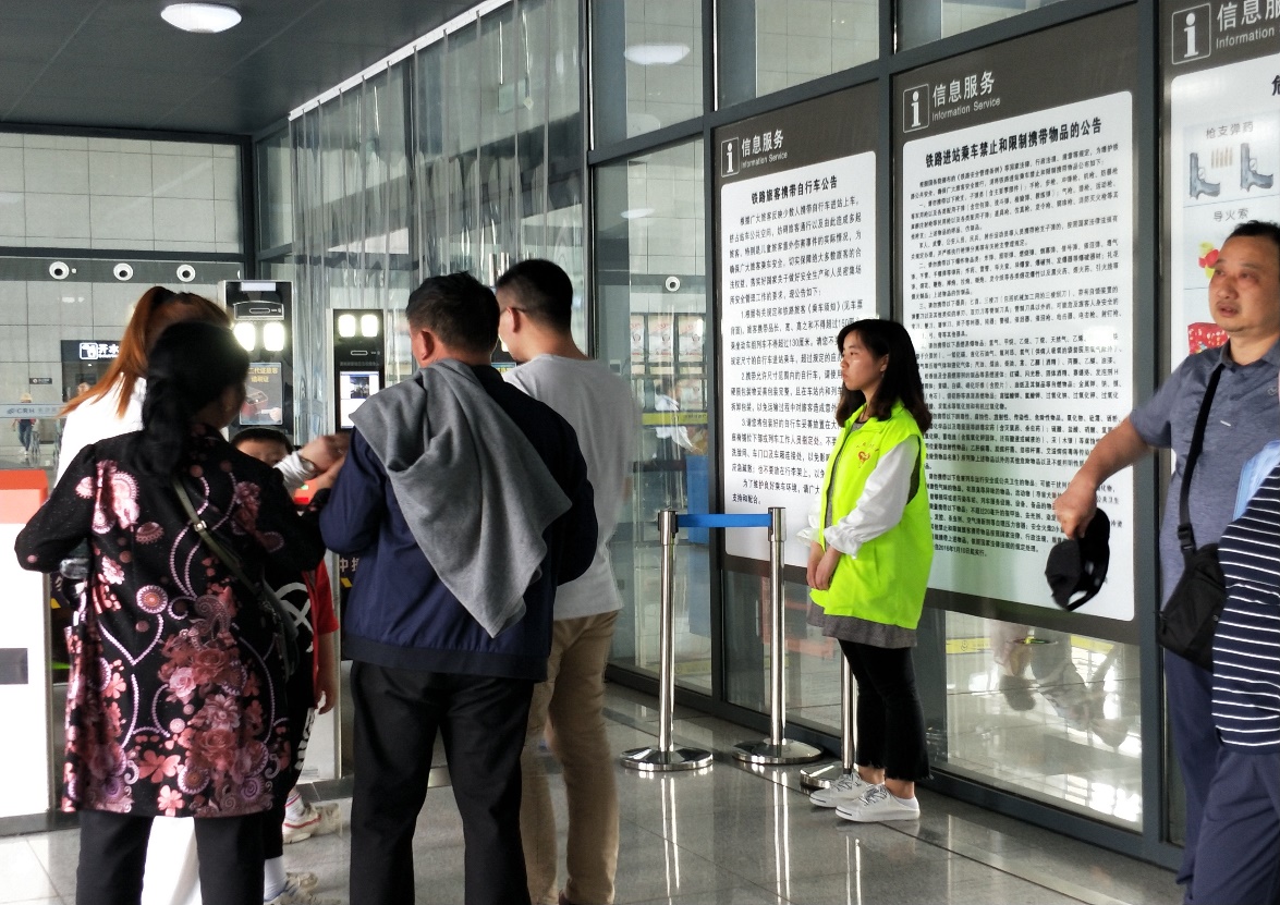 在进站口,志愿者们协助旅客使用新引进的检票闸机进行进站检票,引导旅客提前准备好火车票以及身份证,这一工作大大缩短了旅客进站检票的时间,同时也降低了旅客因为检票过安检不及时而误车的概率。