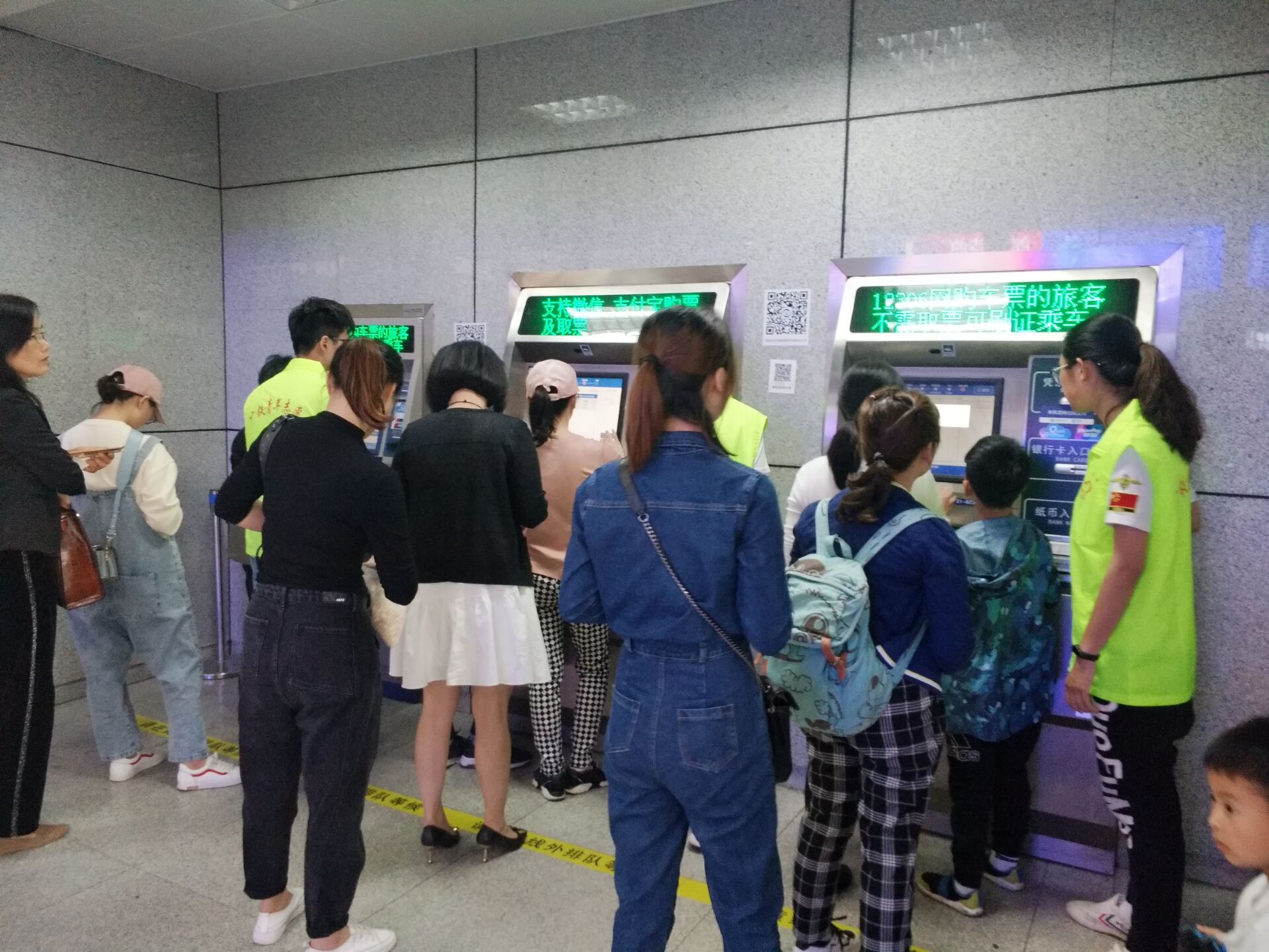 售票厅卖票统一使用自动售票机,而锦泰广场为城际列车乘车站,大多数旅客为老人,不会使用机器购票,所以志愿者的主要工作就是帮助乘客购票,“您好,您到哪里?”、“一共几个人?有小孩子吗?”、“现金微信支付宝银行卡都可以”、“请收好您的证件车票,出门直走右转就是检票口”,这些话不知道重复了多少遍,志愿者们却不厌其烦。系统以及网络的问题导致机器有些卡顿,许多乘客在等待中就有些心急,热心的志愿者们及时安抚大家的内心,售票厅秩序井然。