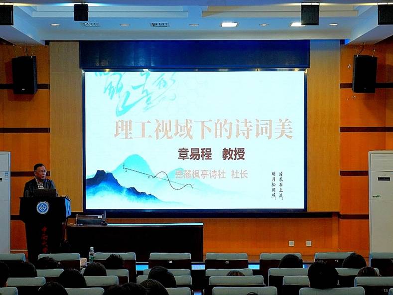 于天心校区世纪楼C201国际报告厅召开《理工视域下的诗词美》主题讲座,本次讲座特邀章易程教授担任主讲人,为在场学子带来一场融汇文理、贯通古今的思想与美学盛宴。学院团委书记蔡明旭与众多学生一同聆听了讲座。