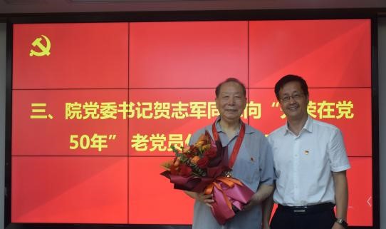 随后,院党委书记贺志军向“光荣在党50年”老党员颁发纪念章,并同他们亲切握手、表示祝贺,青年党员向纪念章获得者献上美丽的鲜花,全场响起一阵阵热烈的掌声。贺书记代表学院向获得者表示热烈的祝贺、致以崇高的敬意。受到表彰的老党员身上生动体现了中国共产党人坚定信念、践行宗旨、拼搏奉献、廉洁奉公的高尚品质和崇高精神。