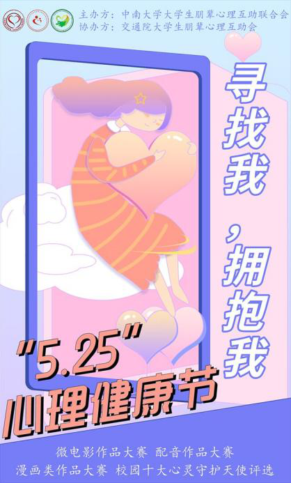 4月1日至4月25日,交通院大学生朋辈心理互助会举办了“5.25”心理健康节系列活动。本次“5.25”心理健康节系列活动以“寻找我,拥抱我”为主题,旨在通过开展漫画大赛、配音大赛、微电影大赛与十大心灵守护天使评选四项活动,帮助同学们解决心理问题,引导同学们学会认识自我,悦纳自我,助力同学们的健康发展。