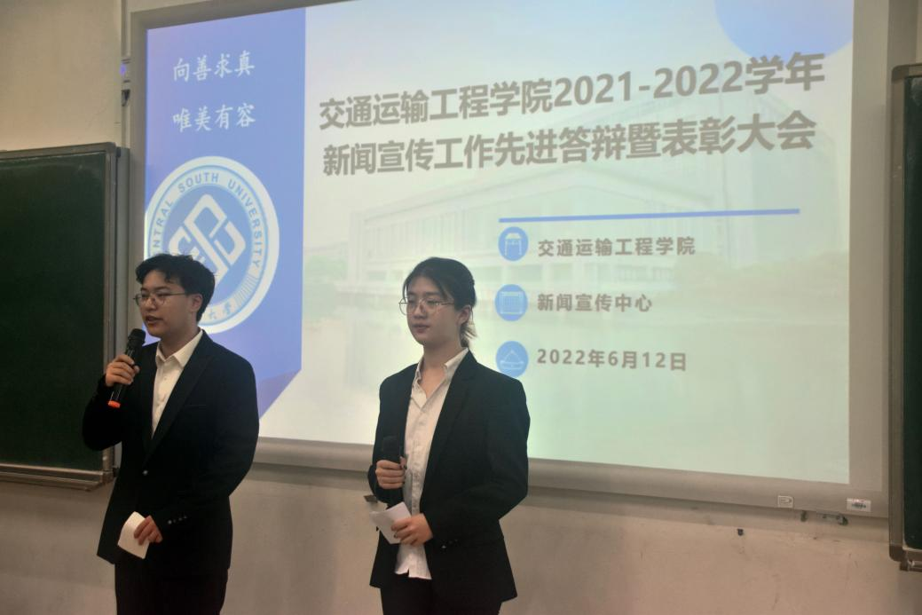 6月12日上午10:00,交通院新闻宣传中心于新校区A座101教室顺利举行2021-2022学年新闻宣传工作先进答辩暨表彰大会。交通院副院长彭勇、交通院党委副书记宋晓东、20级辅导员石晓琪、学院新闻宣传中心指导老师张健出席了本次大会并担任大会答辩评委。交通院全体20、21级宣传委员与宣传专干,新闻宣传中心全体成员,学院心助会、分团委学生会宣传部等部分成员以及部分其他组织新闻宣传工作负责人参加了本次会议。会议由新闻宣传中心干事周扬、王心言主持。