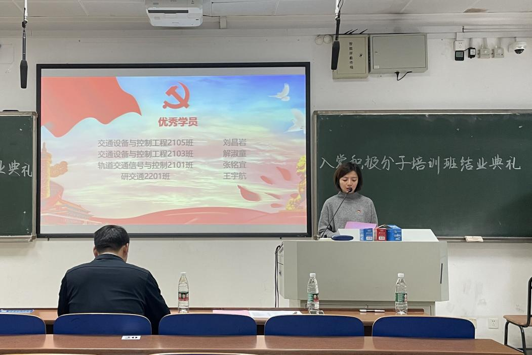 分党校第21期入党积极分子培训班结业典礼在新校区A座204教室顺利举行。交通院党委副书记宋晓东、交通院党组织干事张佳琪、入党积极分子培训班班导师陈晨、王羽珊老师以及本期入党积极分子培训班全体学员参加了此次结业典礼,本次典礼由陈晨老师主持。