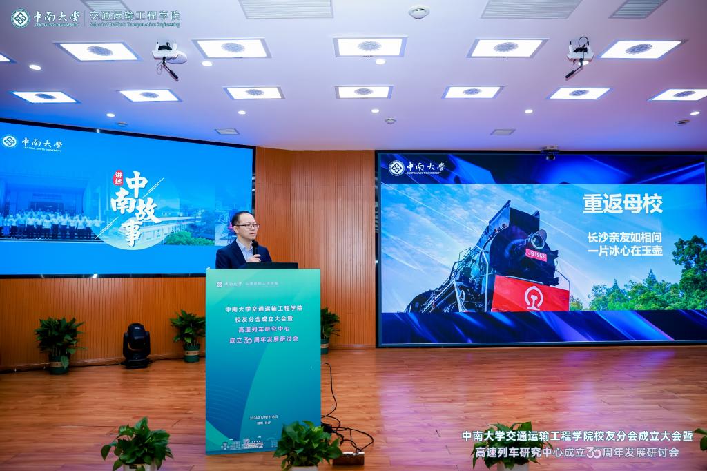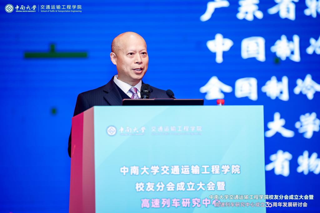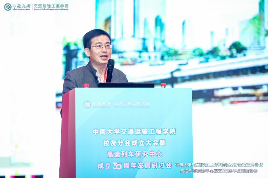 党委副书记黄健陵代表学校致辞。他在讲话中指出,校友分会的成立将进一步团结凝聚广大交通校友,为全球的中南交通人搭建联络情感、交流合作和爱校荣校的平台,共同助力学院和学科的高质量发展。他希望校友分会不仅要做好服务校友的“贴心人”,联系校友的“连心桥”,更要充分挖掘和发挥资源优势,组织广大校友探索深度参与产教融合的新模式,助力校友与母校双向赋能,共创辉煌。