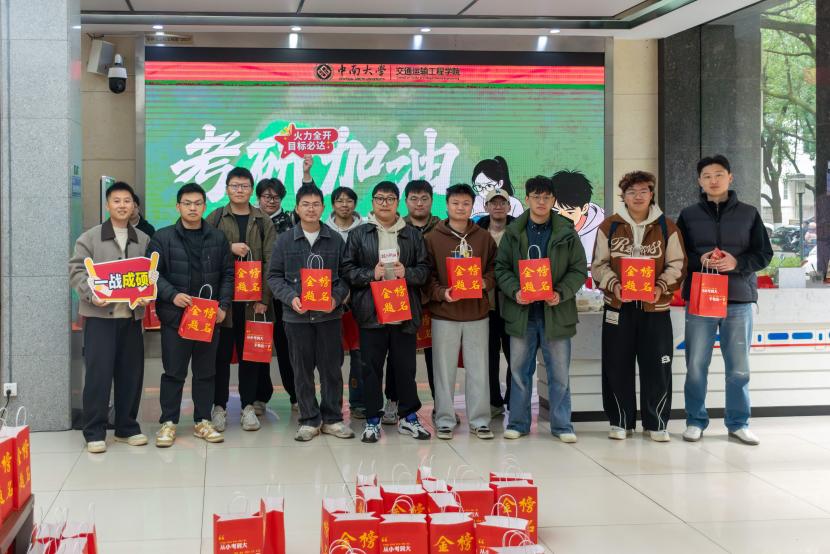 在交通楼一楼大厅举行考研学子慰问活动。学院党委书记袁世平、党委副书记李苑、辅导员张健、蔡明旭、阮琼参加活动,为即将奔赴考场的学子们送上精心准备的“金榜题名”考研礼包及诚挚祝福。