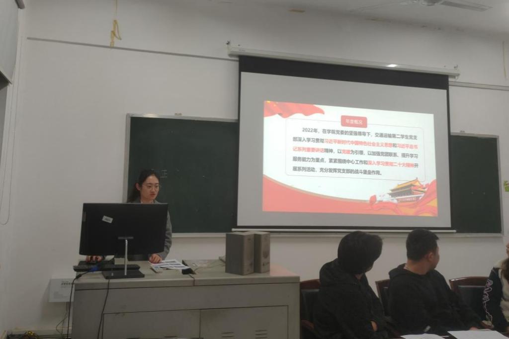 3月1日晚上19:00,交通运输第二学生党支部于铁道校区交通楼515举行了党员大会。大会分为二十大精神的专题学习、2022年度支部书记述职、批评与自我批评及民主评议党员四个议程。会议由曾怡佳同志主持。