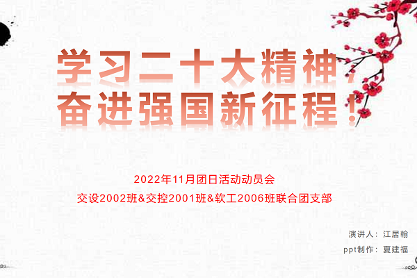 11月10日21:00,软件工程2006班、交通设备与控制工程2002班、轨道交通信号与控制2001班团支部联合举办“学习二十大精神,奋进强国新征程”主题团日活动。此次活动采取线上线下相结合的方式开展,各支部团员踊跃参加。11月8日,各团支部书记同宣传委员带领团员们举行了线上动员会,会议向各位团员详细介绍了这次活动的主题、开展原因以及主要的活动内容和具体实施方案,确保活动的有序进行。在接下来一星期的线下活动中,三个团...