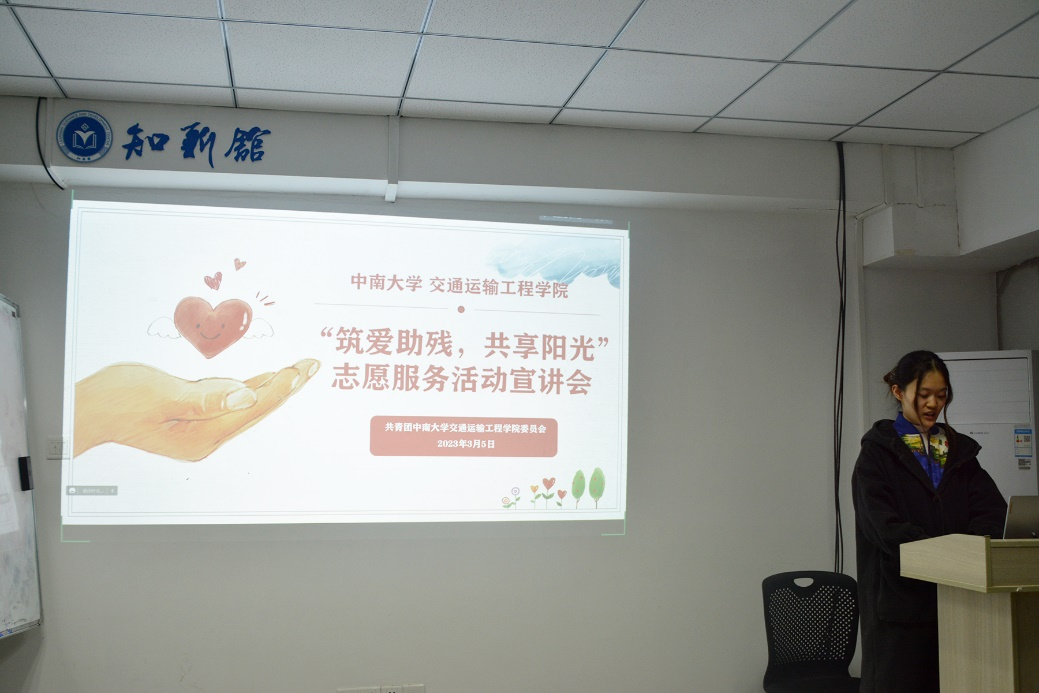 3月5日晚19:00,交通院青年志愿者协会在知新馆团辅B举行了“筑爱助残,共享阳光”志愿服务宣讲会,院团委书记张健老师、华中师范大学特殊教育专业的肖函妤同学以及参与本次志愿活动的全体志愿者参加了本次会议。会议由易思睿同学主持。会议伊始,易思睿同学介绍了雷锋日的精神内涵及宗旨,即让“全心全意为人民服务”的战士被更多人知晓,让“螺丝钉精神”成为印刻在心中永不褪色的记忆。本次关爱残障人士志愿服务活动便是对雷...